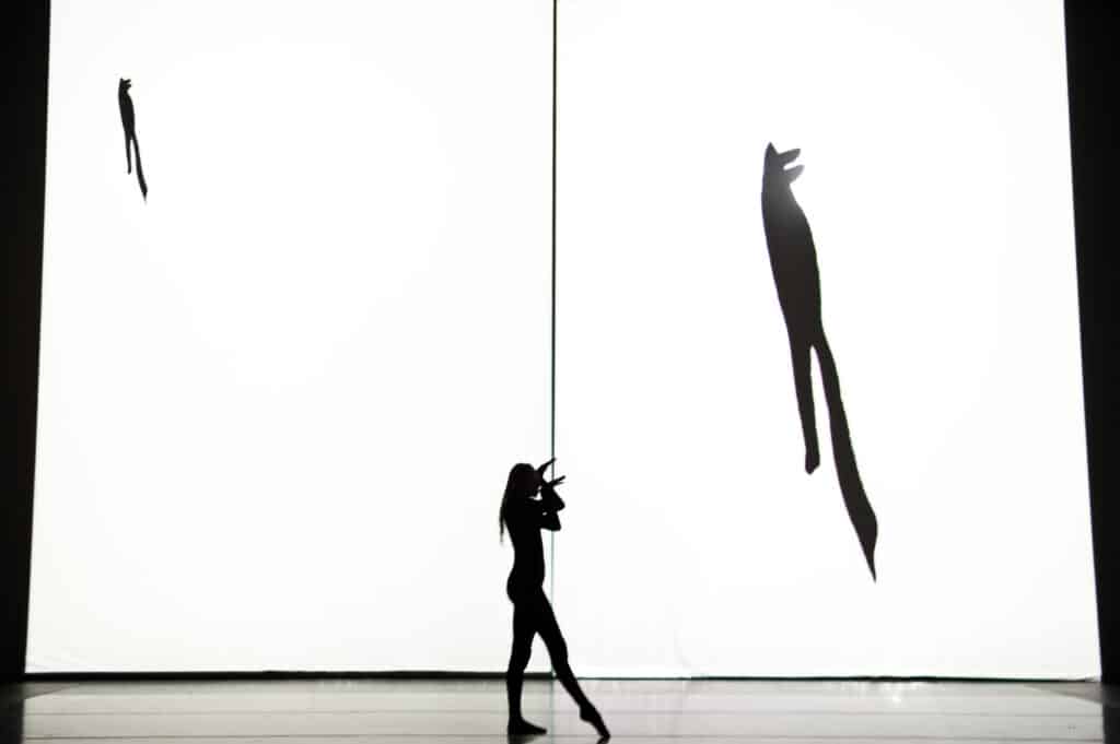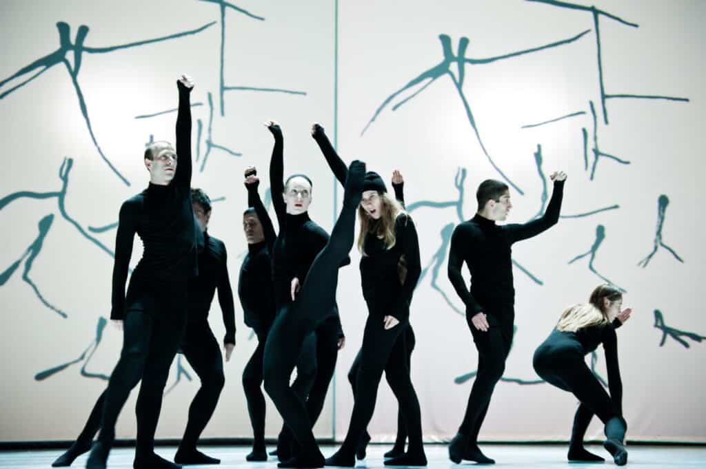 In 1980, Marie Chouinard discovered the book Mouvements by Henri Michaux (1899-1984). In 64 pages of India-ink drawings, a 15-page poem and an afterword, Mouvements presents multiform figures that Marie Chouinard took pleasure in reading literally, left to right and page by page, as a choreographic score. She then proceeded to decrypt the great artist’s drawings and set dance to these “movements of multiple inkjets, a celebration of blots, arms moving up and down the scales.” The book’s transition to dance has been done “word for word”, for even the poem in the middle of the book, as well as its afterword, are included in the choreography. The drawings are projected in the background, allowing audience members to do a simultaneous personal reading of the Michaux score. Echoing the visual presentation of a white page with black drawings, performers dressed in black dance on a white floor.