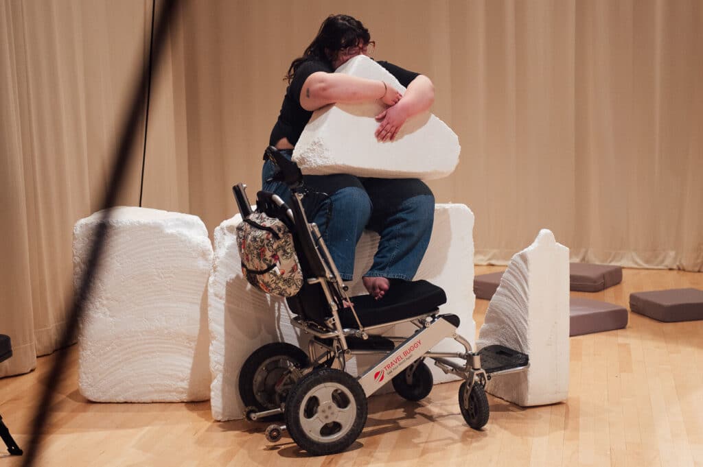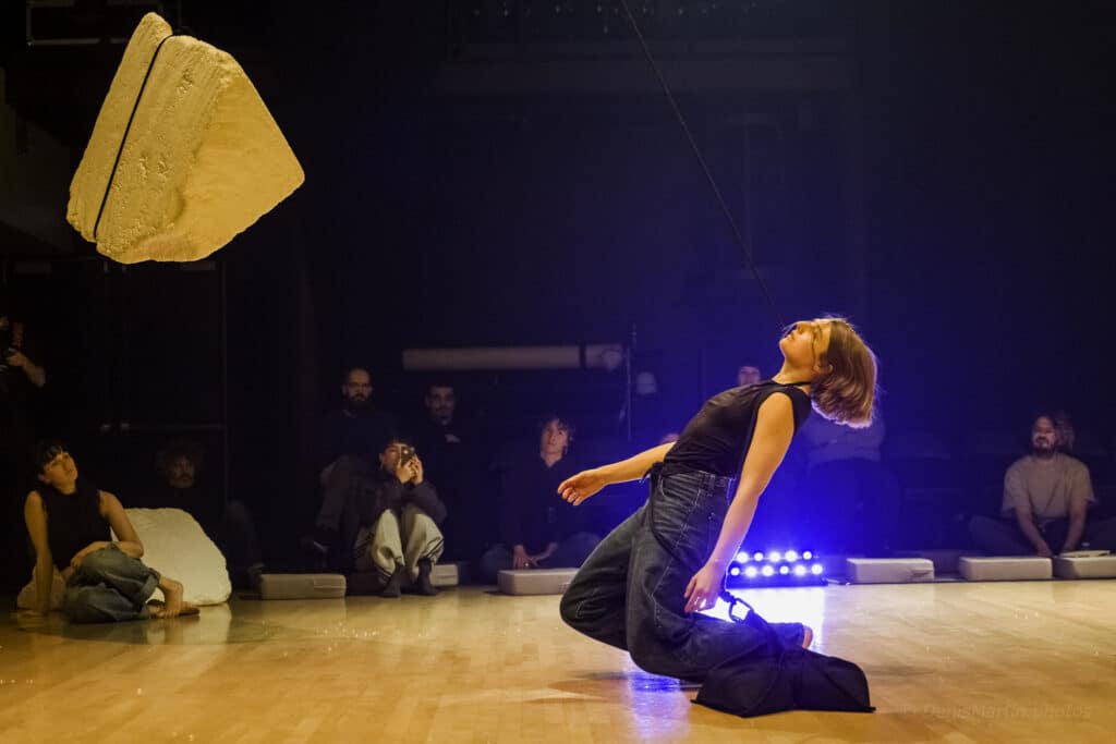 Une installation performative de blocs de styromousse est activée par quatre interprètes qui explorent le bercement. Symbolique d’un processus réparateur, ce motif évoque la tendresse d’une relation protectrice.